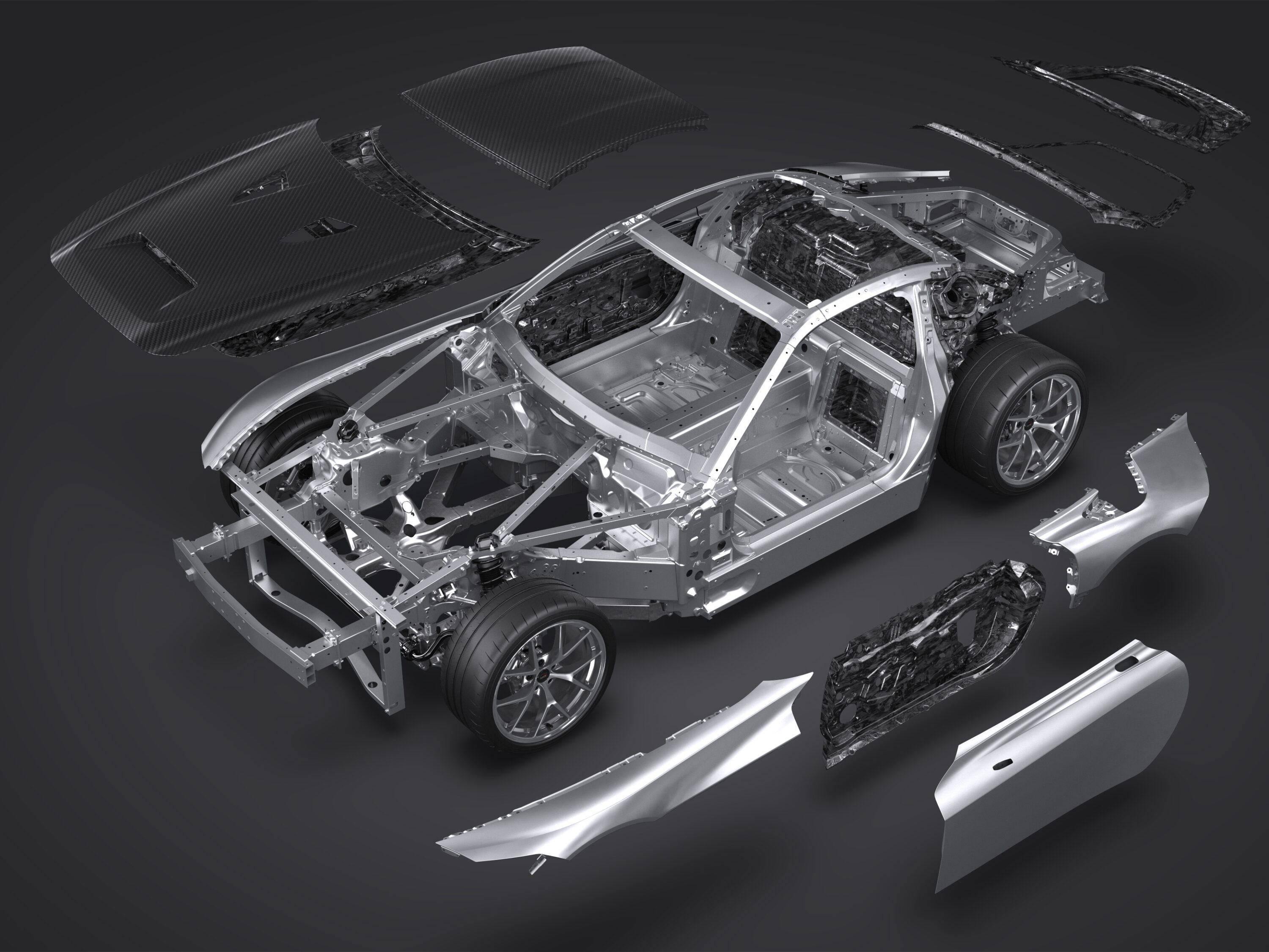 Anscheinend ja. Toyota setzt beim GR GT erstmals auf einen vollständig aus Aluminium gefertigten Spaceframe, der nicht als Gewichtssparmassnahme gedacht ist, sondern als tragende Struktur mit definierten Kraftpfaden. Die Konstruktion kombiniert grosse Gussteile an den Punkten, an denen Lasten in den Rahmen eingeleitet werden, mit Strangpressprofilen, die hinsichtlich Torsionssteifigkeit und Biegesteifigkeit exakt ausgelegt sind. Ergänzend kommen CFK-Elemente zum Einsatz, die nicht für optische Zwecke verbaut werden, sondern als funktionale Panels zur Erhöhung der Gesamtsteifigkeit und zur Reduktion lokaler Schwingungen dienen. Das Entwicklungsziel ist klar: maximale strukturelle Steifigkeit bei möglichst geringer Masse.