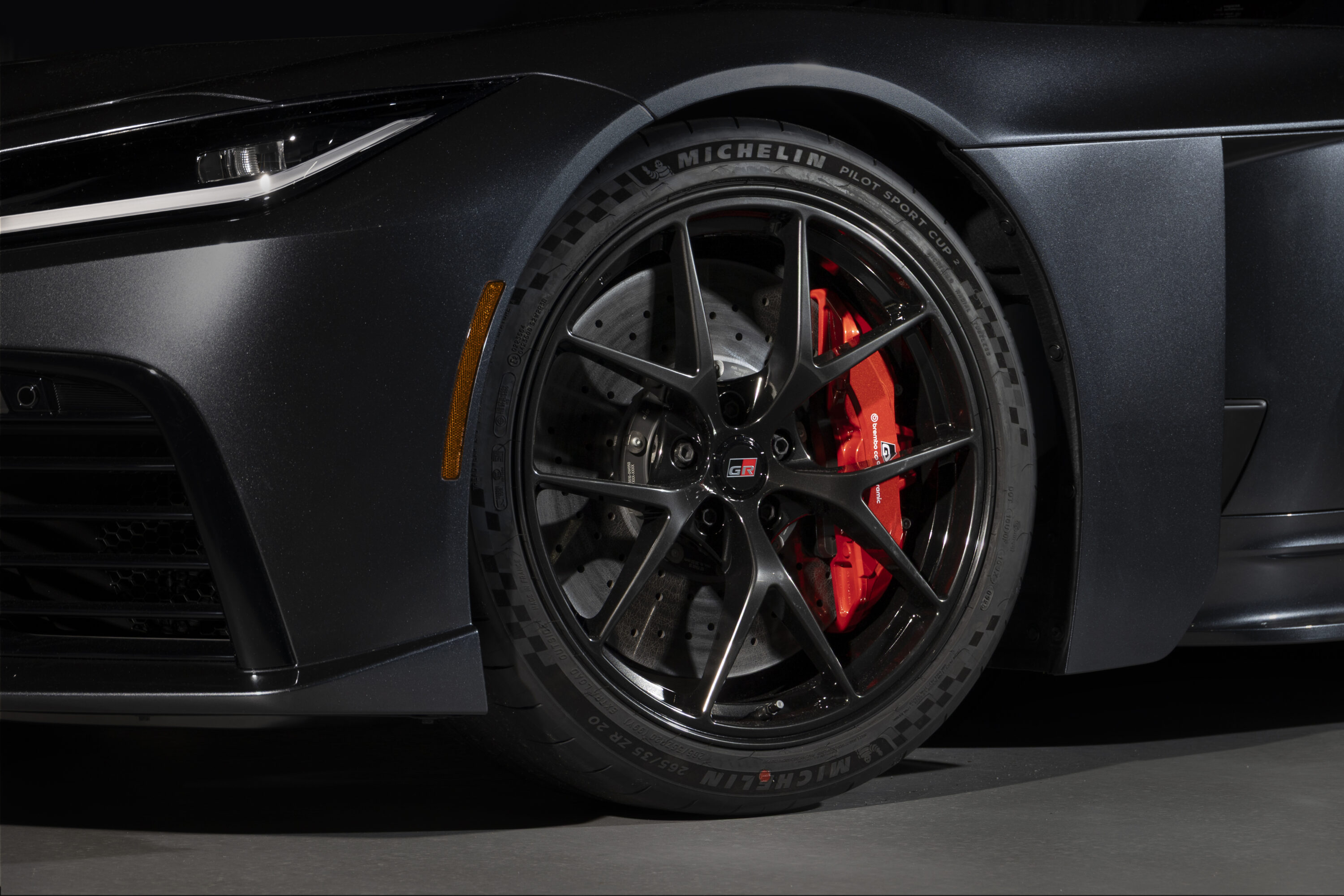 Toyota hat beim GR GT ein klar definiertes Fahrverhalten als Ziel, das auf Linearität, Vorhersehbarkeit und hohe Kontrollierbarkeit ausgelegt ist. Die Basis bildet ein neu entwickelter Doppelquerlenker-Aufbau an beiden Achsen, der so tief in den Spaceframe integriert wurde, dass die Chassisstruktur offensichtlich um die Aufhängung herum konstruiert wurde und nicht umgekehrt. Die Querlenker bestehen aus geschmiedetem Aluminium, was einerseits das ungefederte Gewicht reduziert und andererseits die Steifigkeit erhöht, damit die Kinematik unter Seitenlast nicht nachgibt. Die Geometrie ist so abgestimmt, dass Spurwinkel und Sturzwerte auch bei hohen Querkräften stabil bleiben, was insbesondere bei Hochgeschwindigkeitswechseln entscheidend ist. Als Reifen setzt Toyota auf einen speziell für dieses Modell entwickelten Michelin Pilot Sport Cup 2, der auf das geringe Fahrzeugprofil und die hohe laterale Belastung abgestimmt ist. Die Bremsanlage besteht aus gross dimensionierten Carbon-Keramik-Komponenten von Brembo, die eine hohe thermische Belastbarkeit gewährleisten sollen und im Ansatz eher dem GT3-Reglement als einem klassischen Strassen-GT entsprechen. Die Stabilitätskontrolle ist mehrstufig ausgelegt und soll dem Fahrer definierte Eingriffscharakteristiken bieten, statt lediglich ein einfaches Ein- oder Ausschalten zu erlauben.