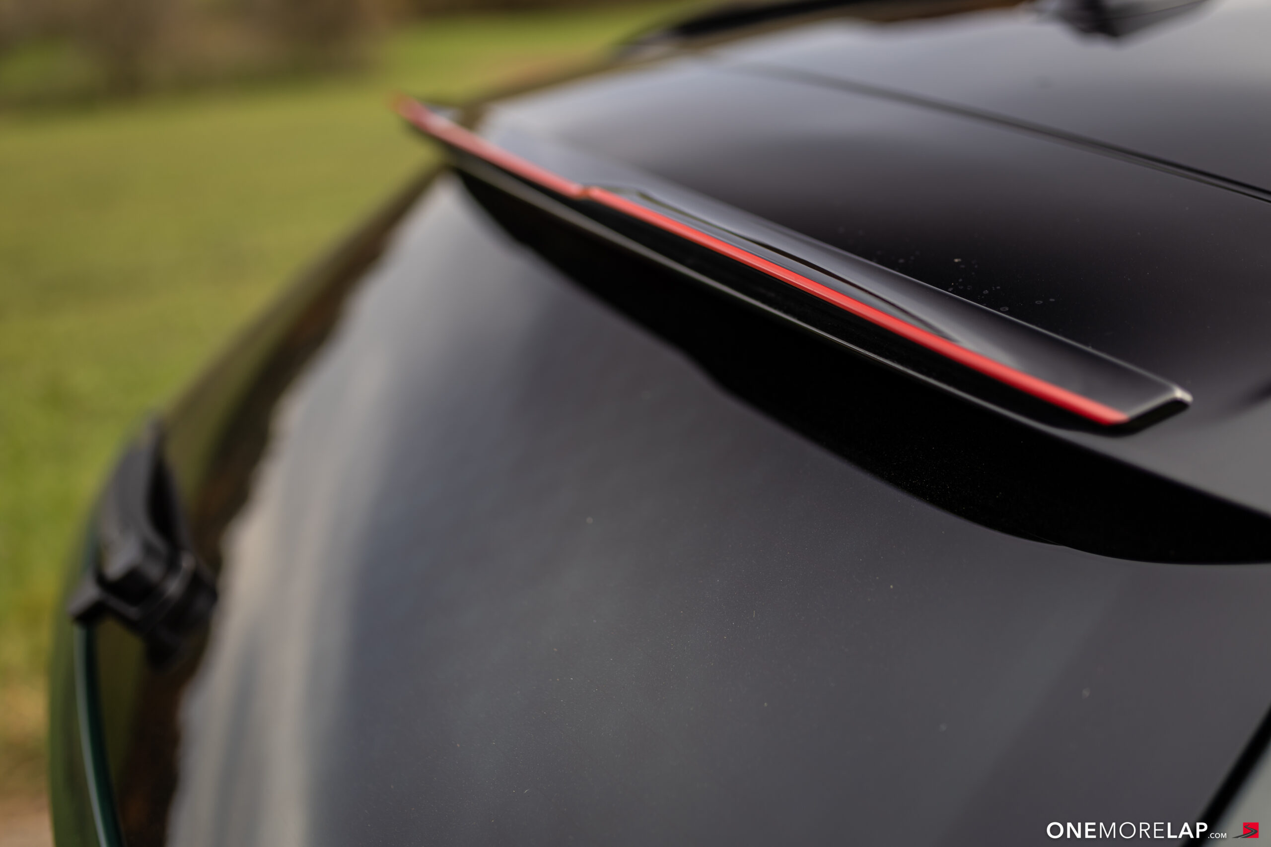 Dazu kommen die roten Akzente. Der rote Rahmen am Dachkantenspoiler, die roten Konturlinien an den Modellschriftzügen, kleine farbliche Reizpunkte hier und da. Sie sollen Motorsport zitieren, wirken teilweise aber fast wie Schminke. Ein Hauch weniger hätte dem Gesamteindruck gutgetan. Gerade weil der Rest des Autos so kompromisslos funktional ist, würde diese gerne abwählen können.
